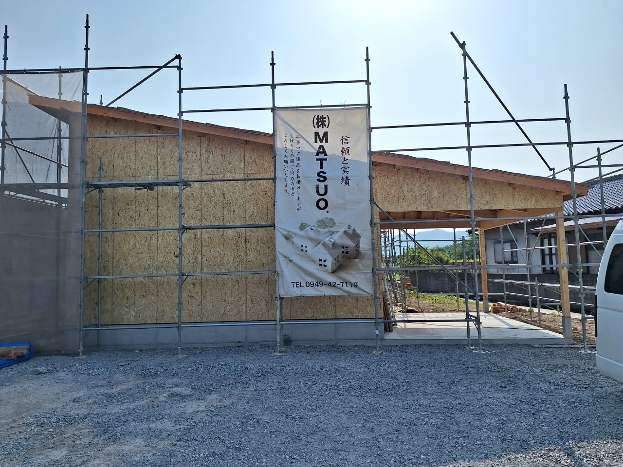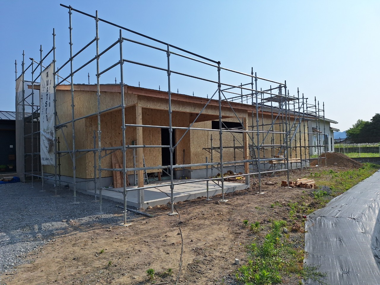 サッシの取付け、床張りが終わり、これから外壁工事、セルロース断熱工事に入ります。