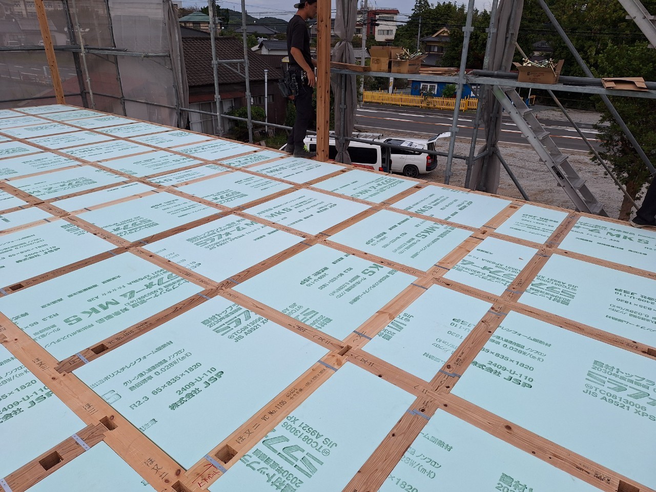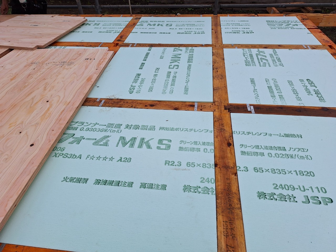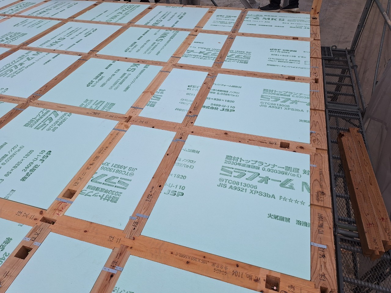 ミラフォーム(押出法ポリスチレンフォーム)65㎜の断熱材を隙間が無いように敷き詰めています。