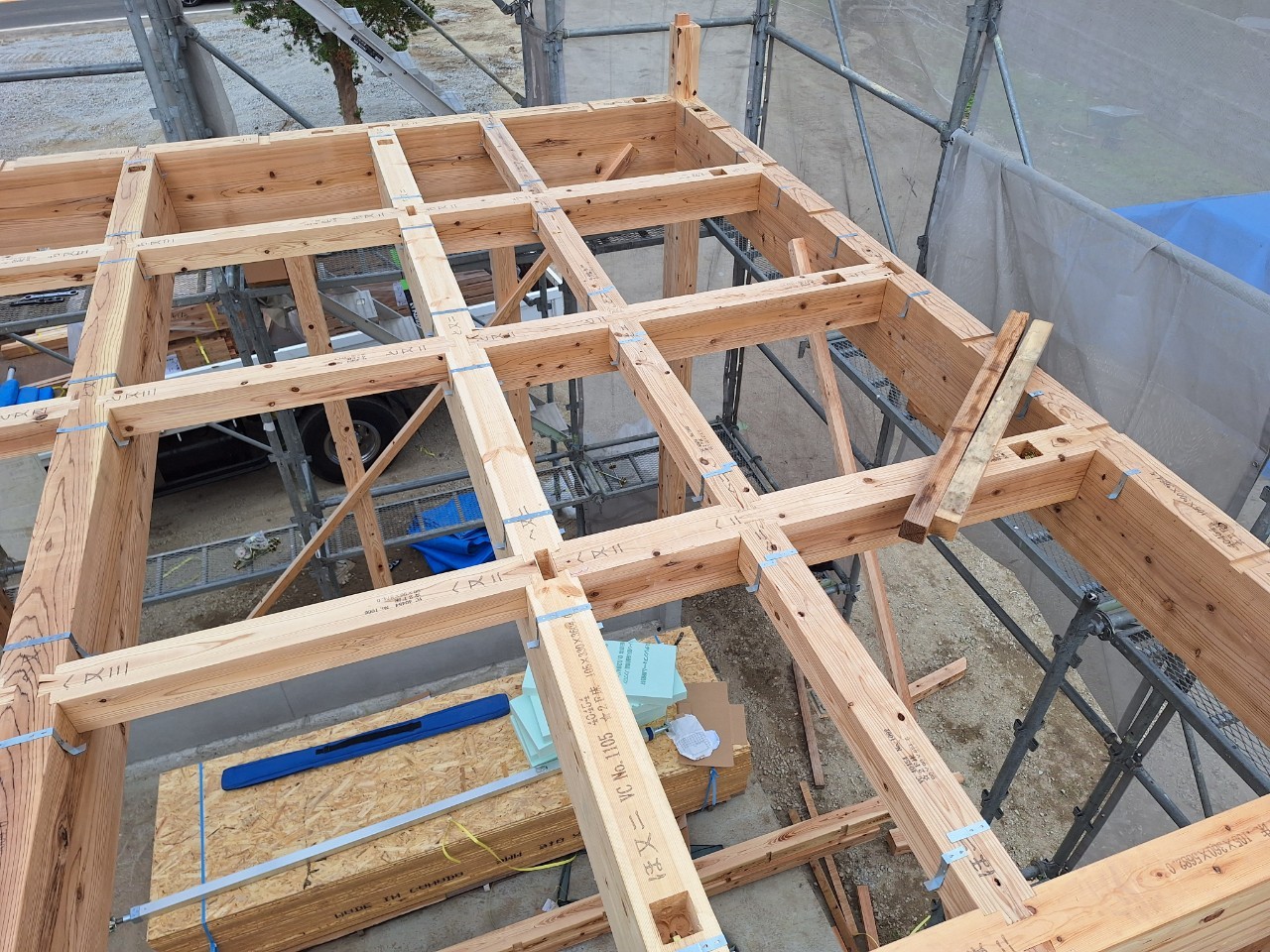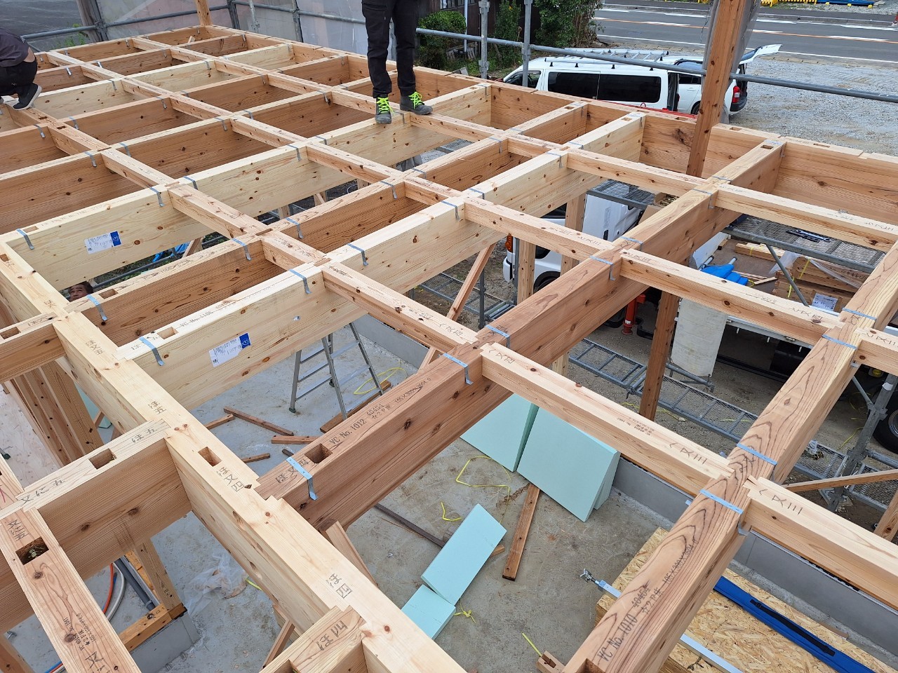 土台敷きとは、基礎コンクリートの上に木材を使って床の土台を作る工程です。