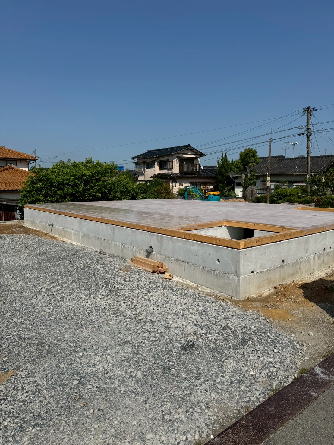 現場には、プレカットされた木材が運ばれ、足場が設置されています。