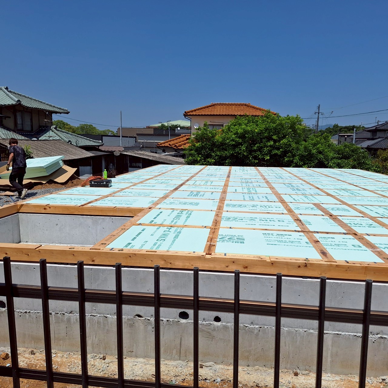土台敷きは基礎コンクリートの上に、土台となる木材を設置し、断熱材を敷き詰めた後、合板を張る作業です![]()