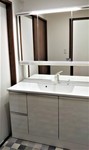脱衣所と洗面化粧台の間に扉を付けていますが、床は同じものを使っているので統一感があります。